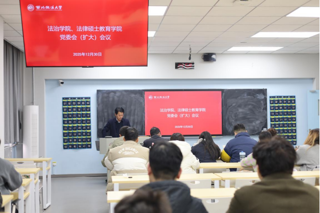 12月30日,法治学院、法律硕士教育学院在雁塔校区召开党委会(扩大)会议。会议深入学习领会习近平总书记重要文章《推进党的自我革命要做到“五个进一步到位”》的核心要义与实践要求,并对2025年度学院党支部书记履行党建工作职责情况进行了现场述职评议考核。学院领导班子、党委委员、党支部书记、全体辅导员参加会议。学院党委书记张学龙主持会议。