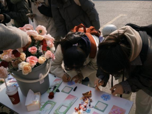 活动现场早已被精心布置,色彩鲜明的主题展板前,鲜花与卡片相映成趣。一大早,就有师生陆续驻足,在工作人员的引导下领取便签纸和绘画工具,或写下最近的小确幸,或留下对陌生人的真挚祝福,或分享成长路上的感悟。