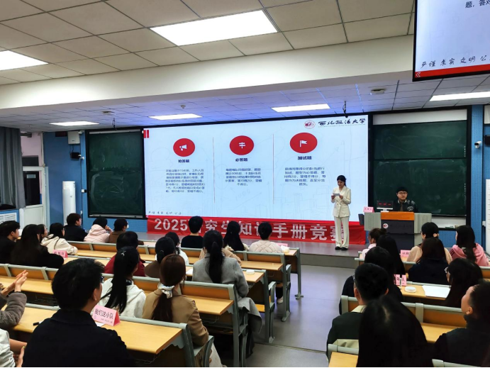本次竞赛以《西北政法大学研究生手册》为核心蓝本,涵盖培养流程、学术诚信、奖惩制度等关键内容,设置必答题、抢答题、风险题三个环节,既考验团队对知识的精准掌握,也注重临场反应与协作配合。必答题环节,各队伍沉着应答、稳扎稳打,展现出扎实的知识储备;抢答题环节,选手们眼疾手快、果断出击,比分交替上升,现场掌声与欢呼声此起彼伏;风险题环节,各队策略博弈、敢于挑战,将比赛气氛推向高潮。答题间隙穿插的互动问答环节,让在场观众也积极参与其中,在轻松氛围中巩固手册知识。